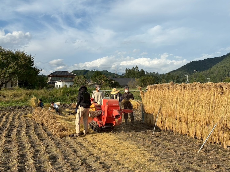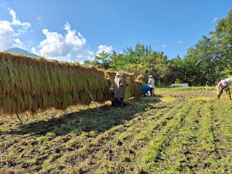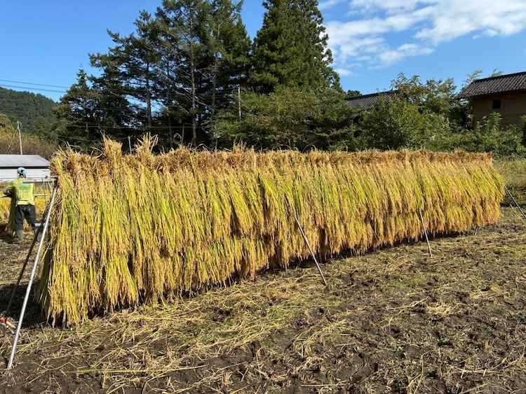 はざと呼ばれる物干し台を、田んぼに立て、稲を逆さに干します。秋風と日にさらして、じっくり乾かしたお米はふっくらとつややかに仕上がります。