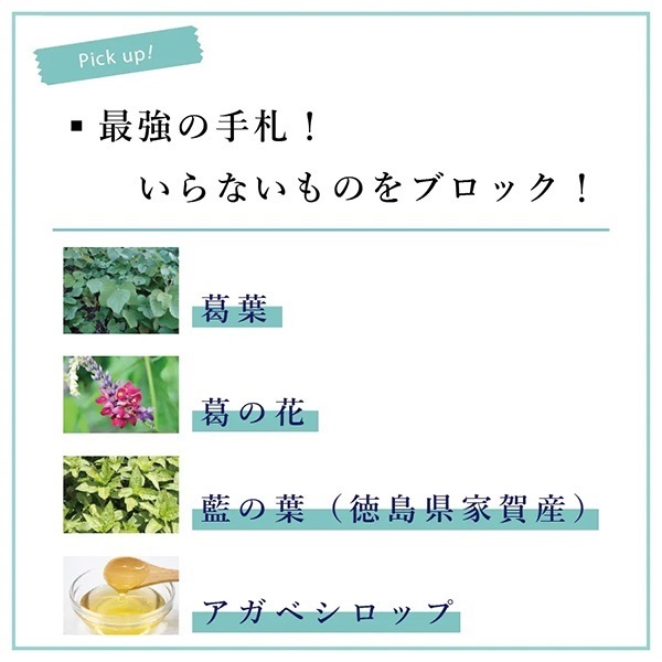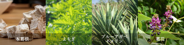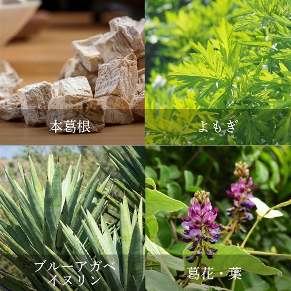 原材料名 アガベイヌリン(メキシコ)、キャロブ、葛粉(国産)、よもぎ粉(国産)葛花(国産)、竹炭(国産)、塩(メキシコまたはオーストラリア)、有機藍粉(徳島県家賀産)、風化貝カルシウムソマチッド(北海道産)