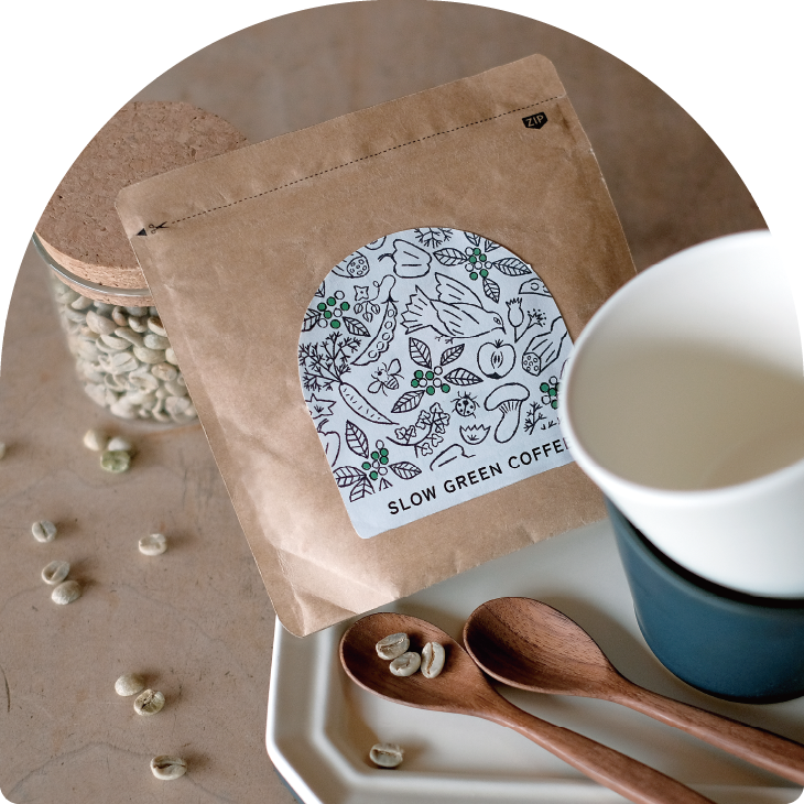 普段目にする一般的なコーヒー豆は焙煎された状態なので茶色ですが、焙煎前の生豆(きまめ)は淡い緑色をしています。この生豆が、英語だと「グリーンコーヒー」と言われています。スローグリーンコーヒーで使用している生豆は、100%無農薬有機栽培で、マヤの聖地チアパス高原の完熟豆を使用。