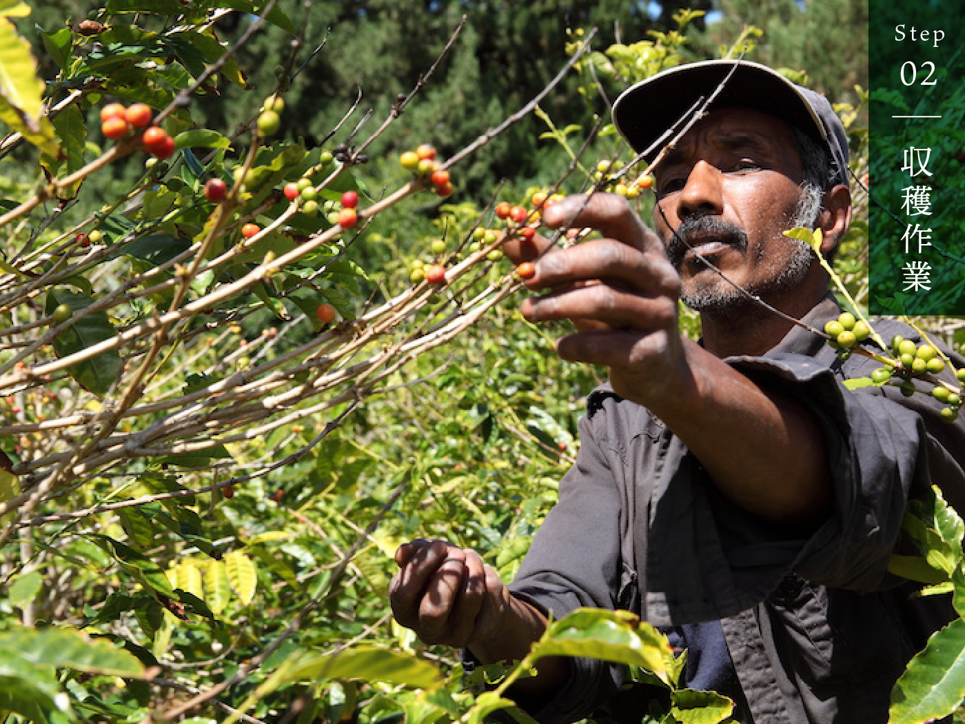 苗木がコーヒーチェリーをつけるのに約3~4年。大切に育てたコーヒーの木から、完熟したコーヒーチェリーのみを経験豊かな農民がひと粒ひと粒ていねいに手作業で摘み採ります。