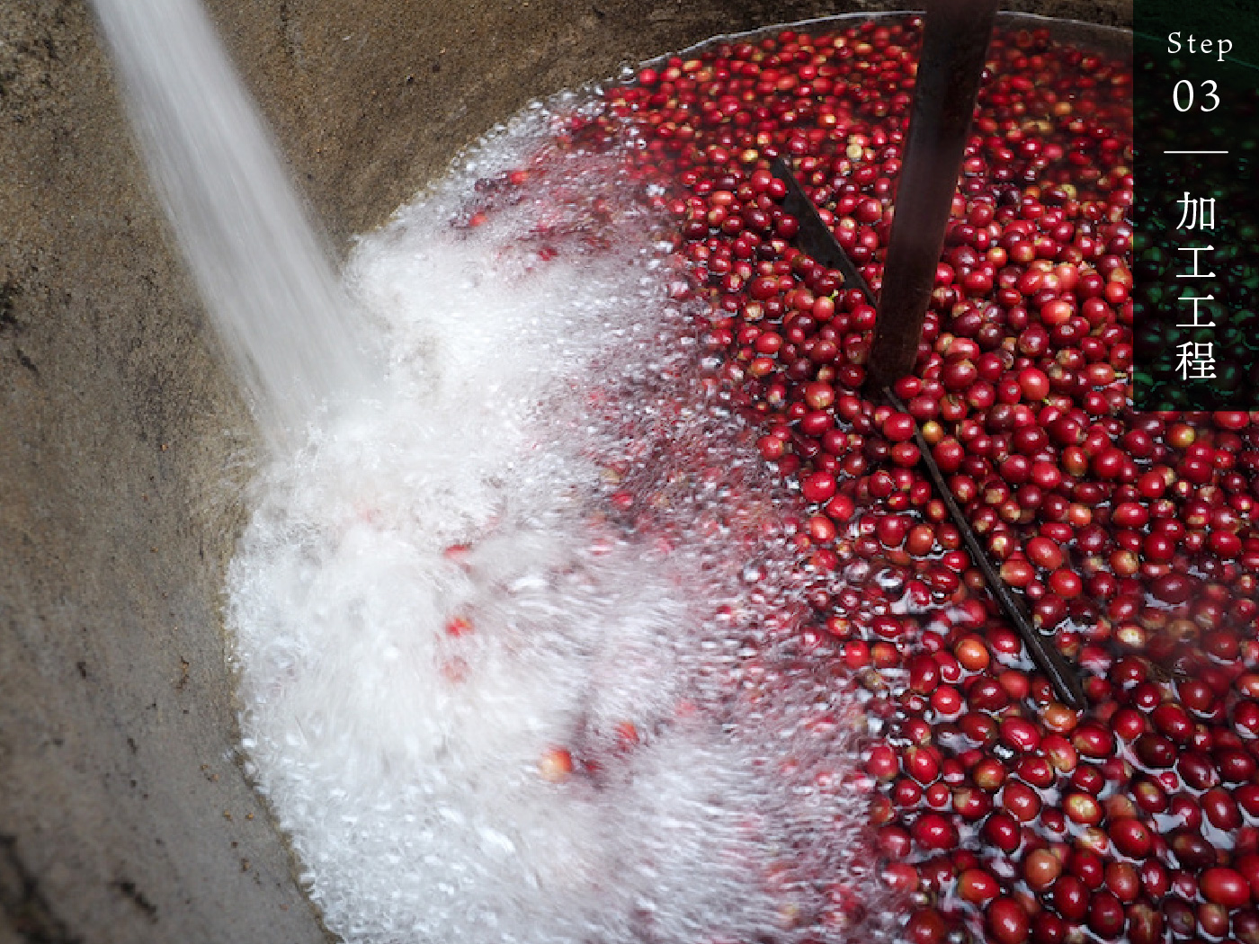 収穫されたコーヒーチェリーをすばやく加工します。果肉除去機から水路を通過しながら、発酵タンクに移動します。発酵が終わると自然水できれいに洗われ、乾燥工程へと移ります。