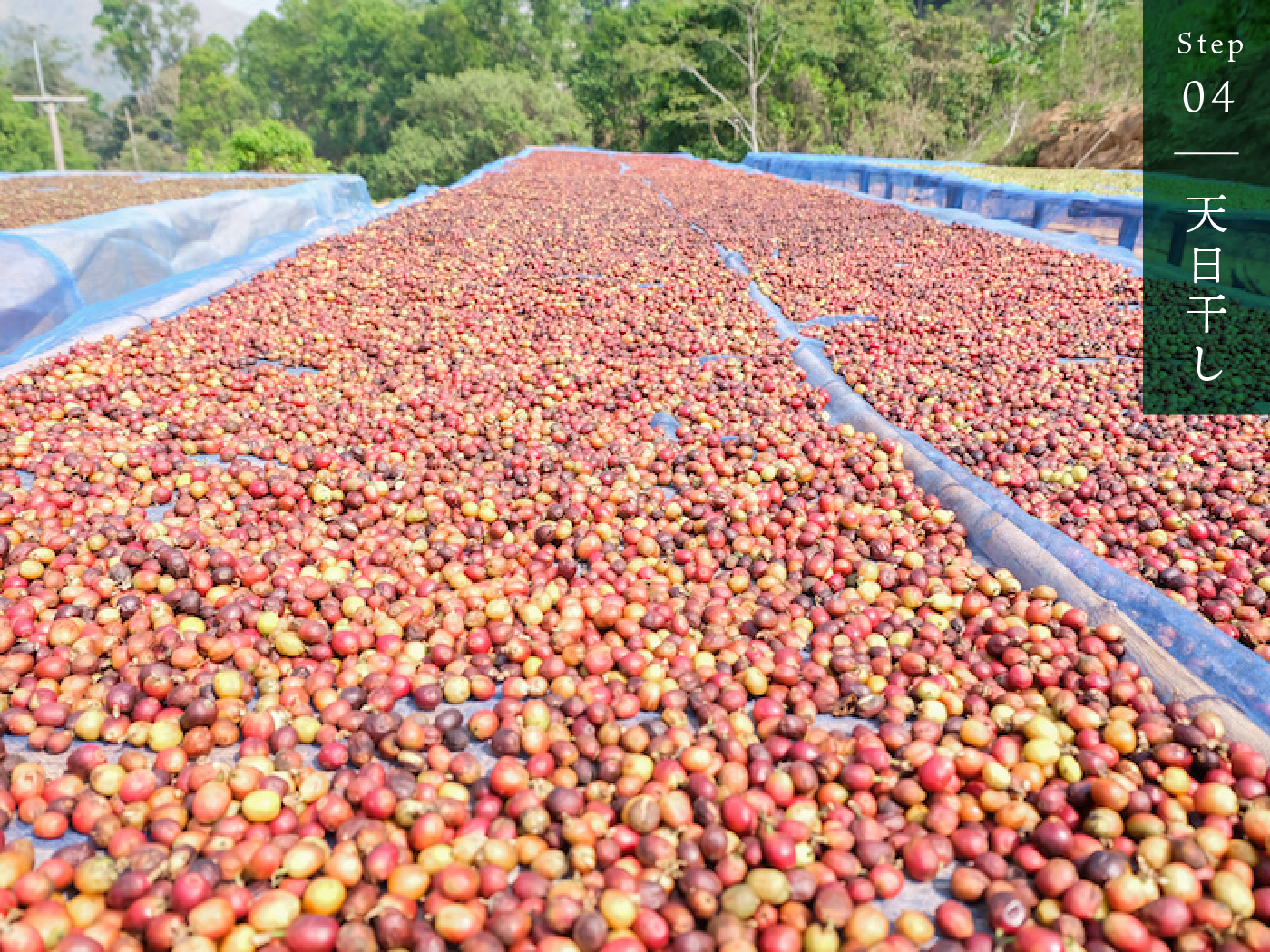 乾燥は天日干し。太陽光をさんさんと浴びながらゆっくり乾燥していきます。自然光は加工後に残った水分や不純物を取り除きます。この自然のしくみにより、二酸化炭素を排出することなく最高品質のコーヒーが誕生します。