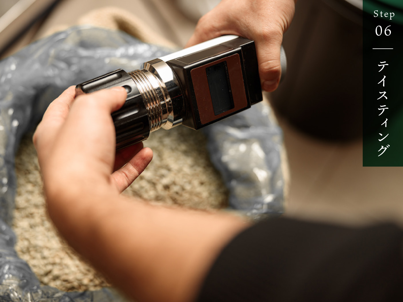 コーヒー豆の品質・味や香りのテストがくり返されます。全体的な見た目の美しさ・焙煎具合・粉砕の均一さなど、クリアした豆のみがお湯で抽出され、最後にコーヒーの味と香りのチェックへとたどり着きます。