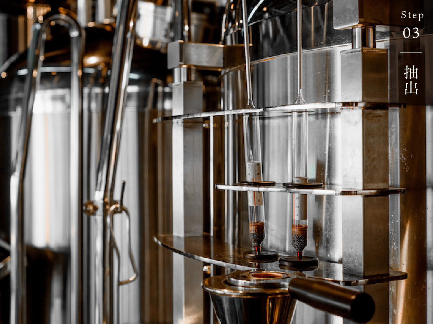 コーヒーの粉末にお湯を注ぎ、脂肪・酸・植物繊維等全成分を抽出します。独自の抽出方法により、バランスのとれたおいしいコーヒー抽出物ができあがります。もちろん豊かな香りも逃しません。